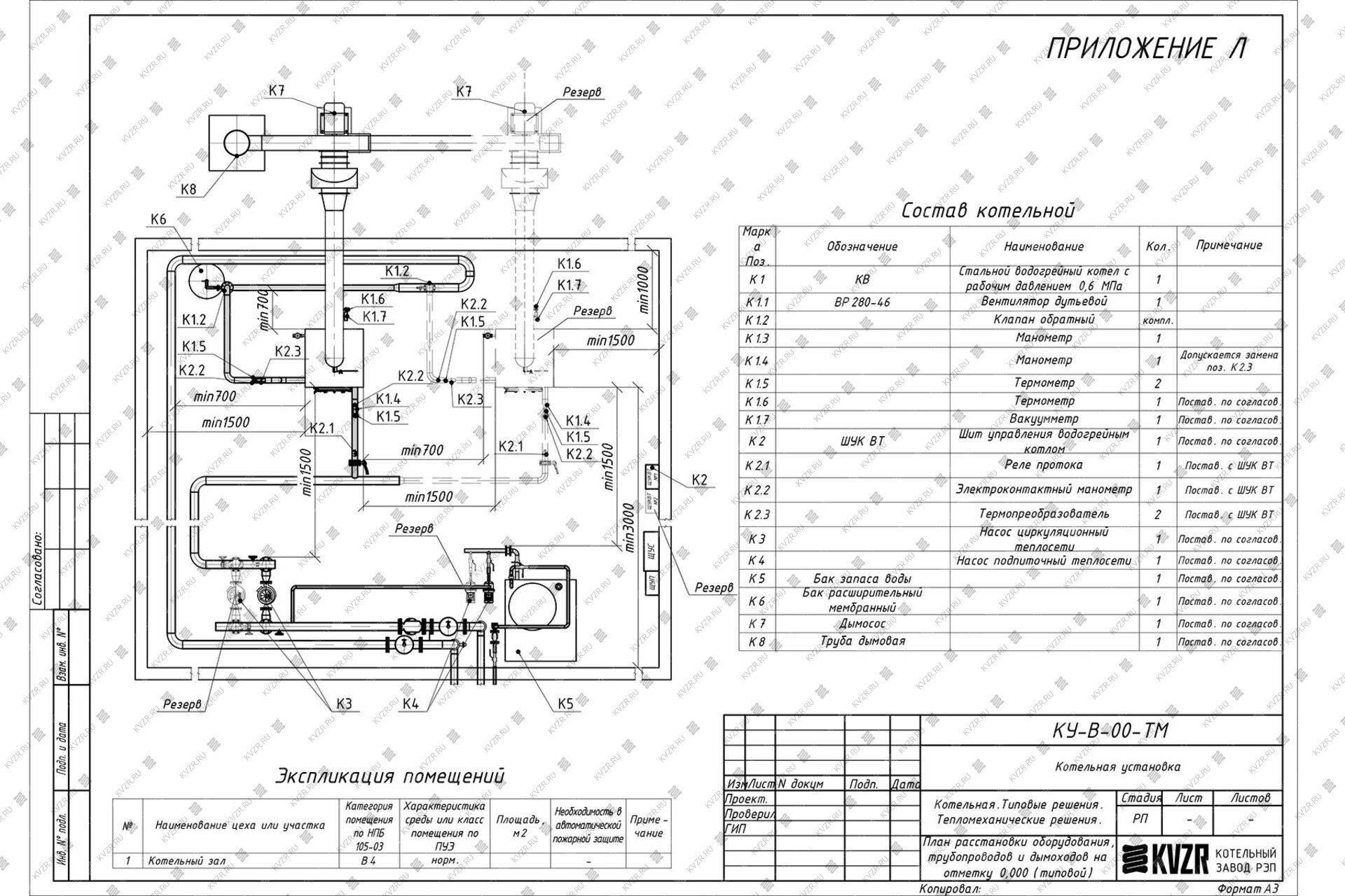 Чтобы правильно подключить котел КВ-0.25 без дымососа на самотяге в котельной необходимо оставить проемы для обслуживания оборудования во время эксплуатации. На представленной здесь схеме указаны их минимальные размеры. Кроме того, в данной примерной схеме монтажа водогрейных котлов и оборудования указан перечень минимально необходимого вспомогательного оборудования для правильной работы котла.
