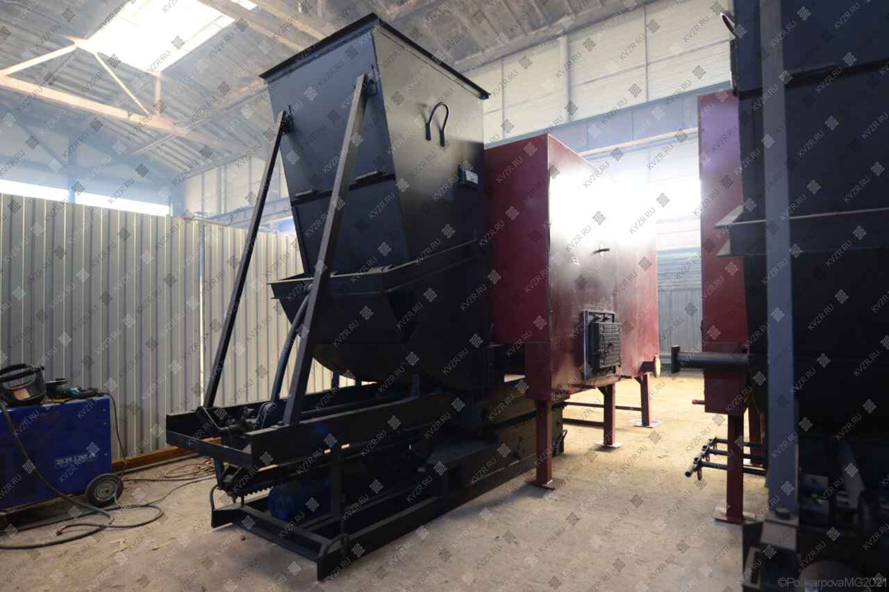 Шлак с топочного полотна сбрасывается вручную, удаление шлака из шлакового канала производиться транспортером золошлакоудаления, либо с помощью телеги. Водогрейные котлы с пневмомеханическим забрасывателем и топкой с опрокидывающимися колосниками - КВм-1,1, КВм-1,25, КВм-1,4, КВм-1,6, КВм-2,0, КВм-2,5, КВм-3,0, КВм-3,5, КВм-4,0.