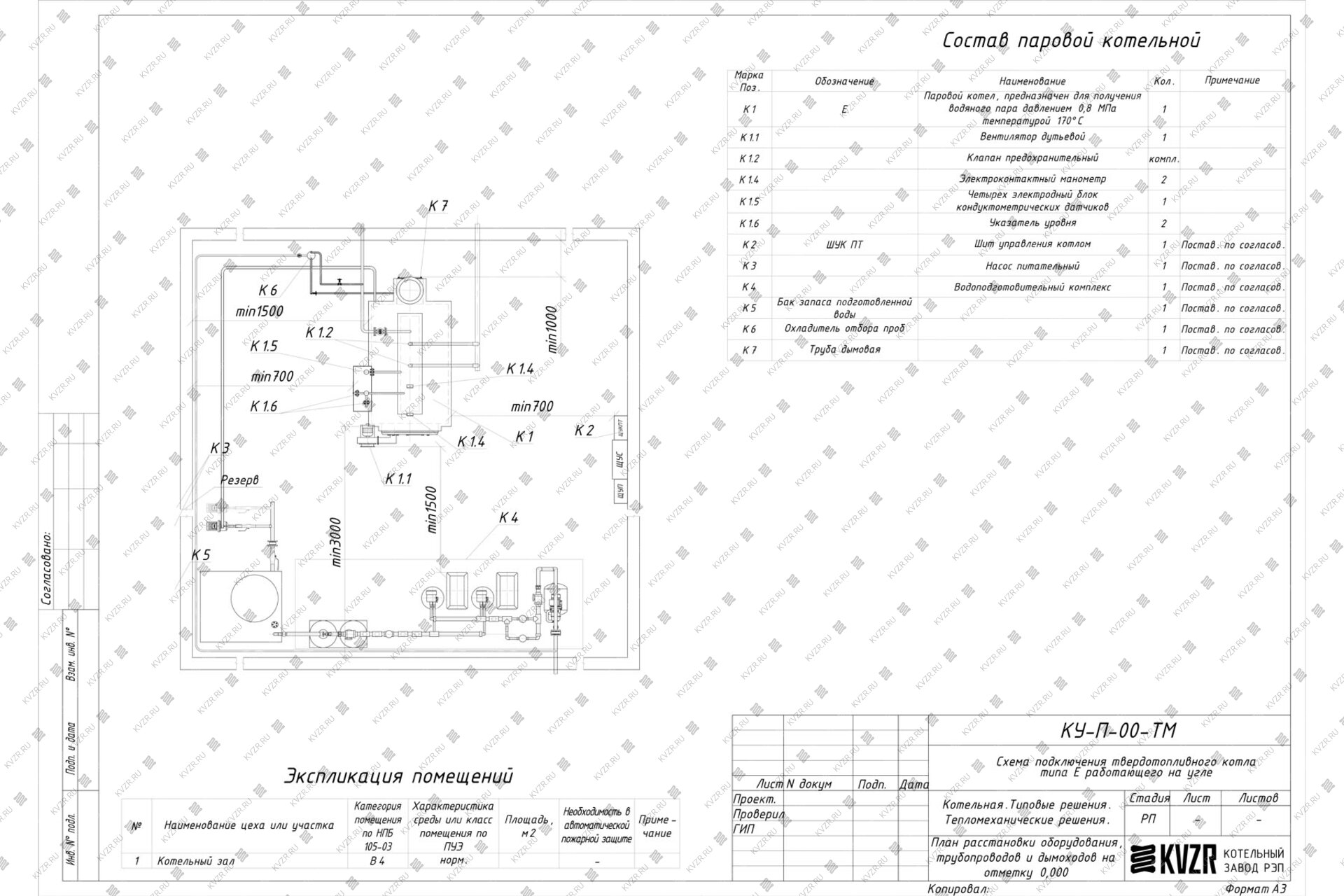 Чтобы правильно подключить угольный паровой котел 2000 кг / 2 т пара -130 °С -0,17 МПа / 1,7 кгс/cм² в котельной необходимо оставить проемы для обслуживания оборудования во время эксплуатации. На представленной здесь схеме обозначены их размеры. Кроме того, в данной примерной схеме монтажа паровых котлов и оборудования указан перечень минимально необходимого вспомогательного оборудования.