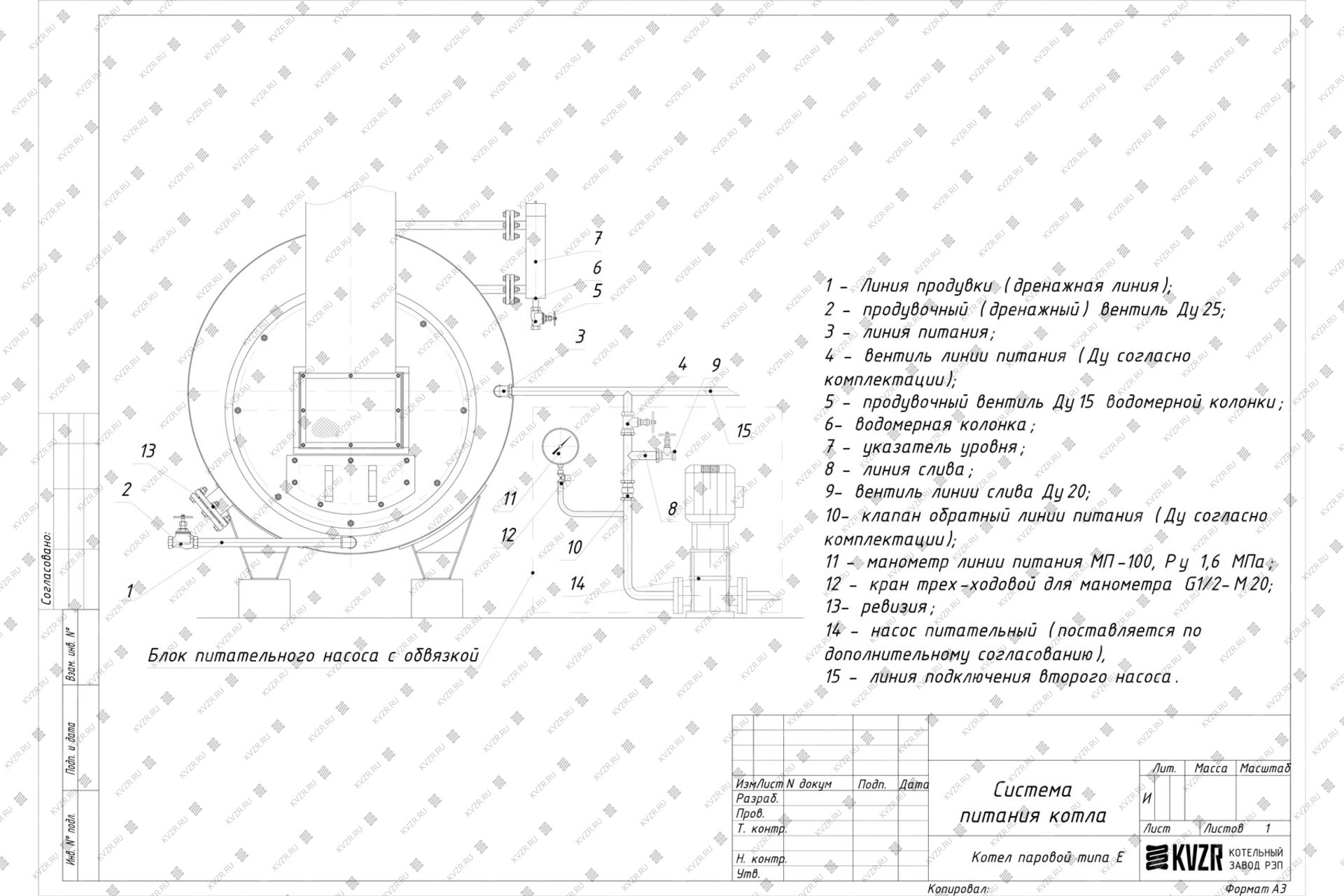 При работе котла питание водой парового котла Е-0.3-0.9 М мазутного производится через штуцер.